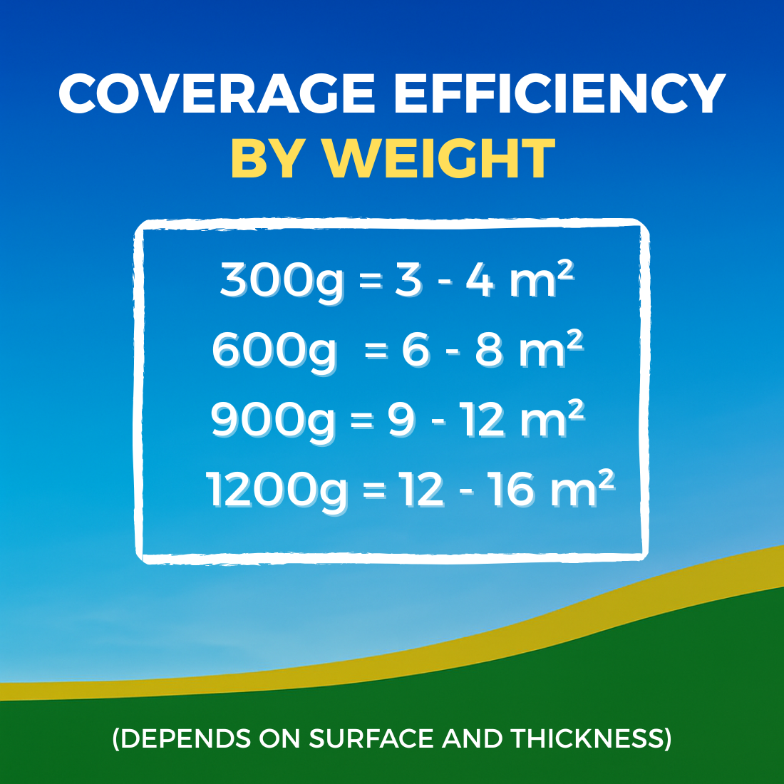 Coverage: 300g β‰ˆ 3–4 mΒ², 600g β‰ˆ 6–8 mΒ², 900g β‰ˆ 9–12 mΒ², 1200g β‰ˆ 12–16 mΒ² (approx., depends on surface and thickness).